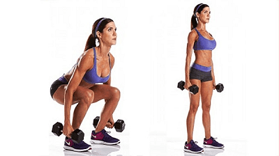 Встаньте прямо, ноги на ширині плечей, у кожній руці по гантелі. Повільно присідайте, поки стегна не будуть горизонтально підлозі, потім повільно поверніться у вихідне положення. Зробіть три підходи з 10-15 повторень.