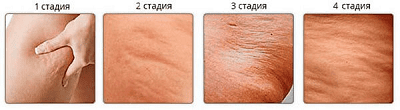 4. При четвертій стадії целюліту процеси третьої стадії поглиблюються і триває утворення сполучної тканини. Дрібні вузлики зливаються в окремі щільні ділянки. Шкіра на уражених ділянках бліда, холодна, хворого виду. Целюліт сильно виражений на всіх уражених ділянках тіла, при дотику шкіра тверда та ущільнена. При натисканні її часто відчувається біль.