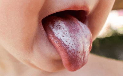 Білі сирні скупчення, або пластівцевий наліт, або дрібні сирні скупчення в порожнині рота на набряклій слизовій оболонці щік, неба, язику, позіхання на тлі гіперемованих тканин рота. Заїди та тріщини в куточках рота через сухість.